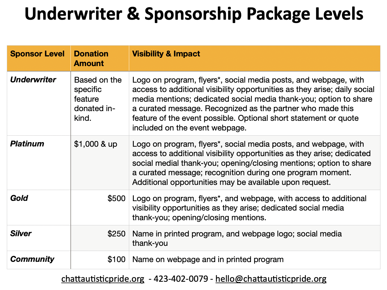 If you’d like to discuss underwriting possibilities, explore additional ideas, or talk through what might be a good fit, we welcome you to reach out to us directly by emailing hello@chattautisticpride.org or give us a call or a text at 423-402-0079